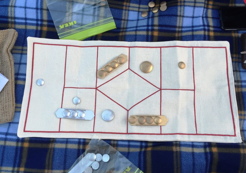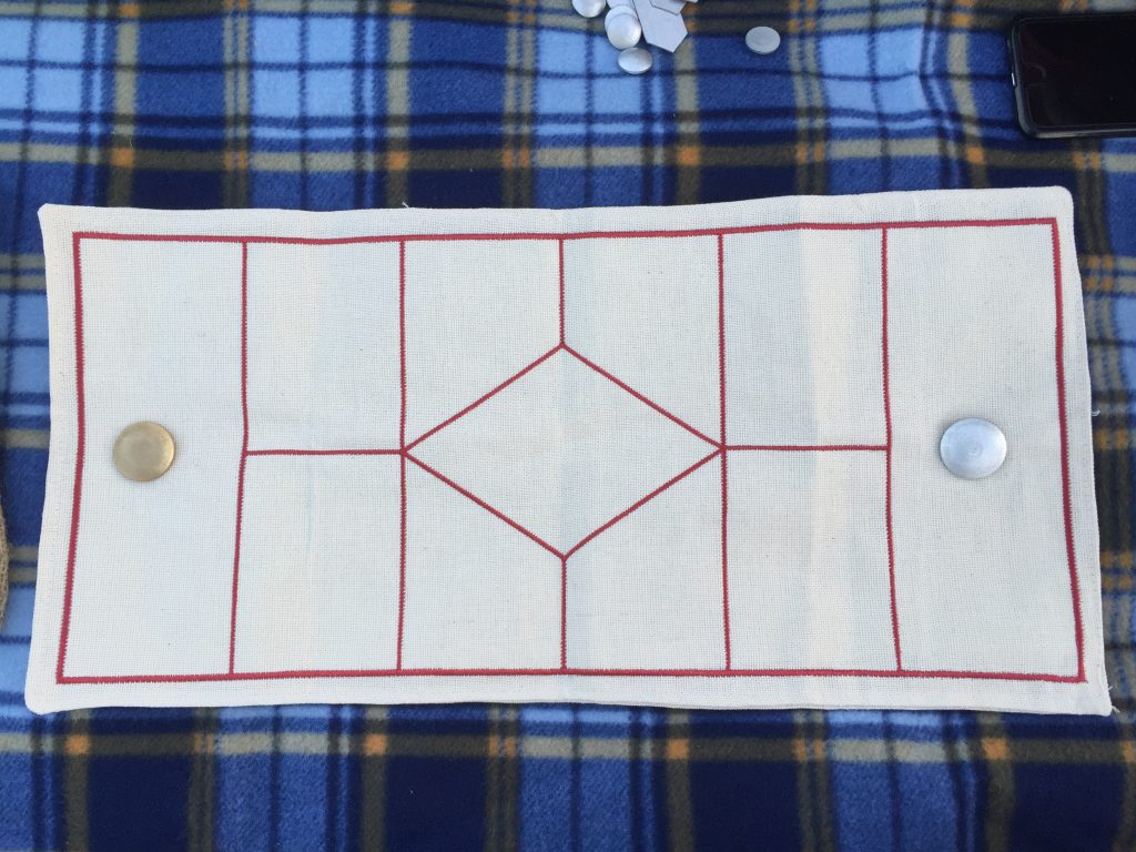 The game comes in gorgeous hessian bag, embroidered with the title and tied with a piece of string. The playing board is also an embroidered piece of cloth and the playing pieces that I received were handmade from wood and painted in metallic gold and silver. While these pieces looked and functioned well, I believe the design of the ‘Karve’ (Viking ships) is going to change for the final version of the game. Hɪrð is extremely portable – the cloth playing board and wooden pieces, along with the rules, all fit neatly into the small hessian sack, and the game is very light. Many games advertise their portability, but few are truly portable; a light breeze can put an end to any outdoor attempt to play a board game which involves cards or other paper pieces. Having taken Hɪrð to the park to play the game in preparation for writing this preview I can say with certainty that this game could easily be played almost anywhere.