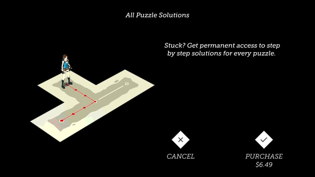If, for some reason, you happen to get stuck, you can of course purchase hints for a nominal fee. As the game is never difficult enough to leave yourself scratching your head for an extended period of time (which would make you look like a complete idiot on the bus), there is no reason to expend your hard earned dollars on hints. If you feel that you must throw more money at this game though, you can also purchase other costumes that aren’t unlocked through normal gameplay. As far as I understand, these costumes don’t change the gameplay at all, they just simply make Lara look a little more fashionable.