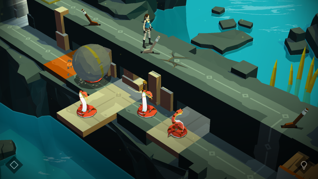 Other environmental elements that increase puzzle difficulty include the aforementioned pressure plates, as well as partially broken floor plates that break open after passing over them twice, which closes off that path –  and my personal favourite, the giant boulder that incrementally creeps forward with each move. This giant boulder is a nice little homage to Indiana Jones, a character who Lara Croft is obviously indebted to for her existence. The incremental difficulty of these environmental elements slowly ramps up as the levels progress, but never becomes so difficult that levels are impossible to complete.