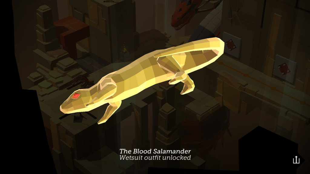 In fact, my one main complaint about the otherwise very good Lara Croft Go is that it’s possibly just a little too easy. As I played through the five different “books” of levels, I had hoped that there would be a gradual rise in difficulty, with the latter levels being exceptionally challenging. As it is, the difficulty does rise, but it’s mostly in the sense that a level will take you a minute to figure out how to reach the end rather than thirty seconds. I died only a few times, and to be honest, most of those times were simply so I could get a screenshot of Lara dying for this review.