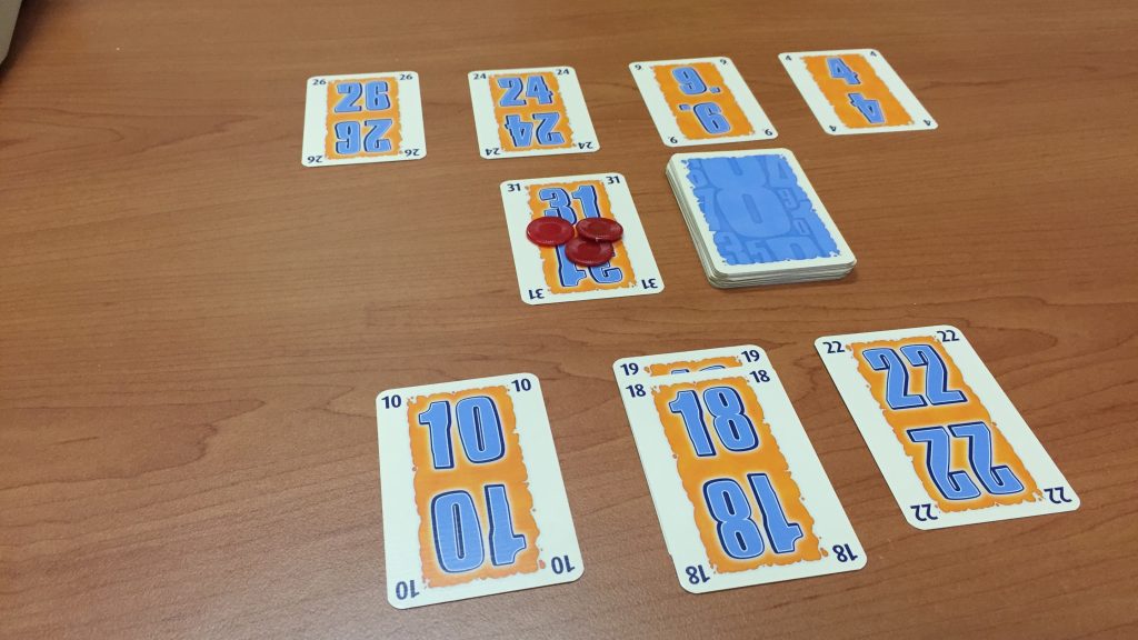 The first player reveals the top card from the draw deck and must decide whether to take the card or pass. If opting to pass, the player must place one of their tokens on the card after which play continues clockwise. Passing might seem like the most prudent option however the associated cost should give you pause as tokens are worth negative score and, if you run out of tokens, you will be forced to take a card. This continues until someone chooses (or is forced) to take the card. When a player takes a card they put it on the table in front of them and collect any tokens that may be on the card. That player then reveals the next card and another round begins. Play continues until the draw deck is exhausted – at which time the points are tallied and a winner declared.