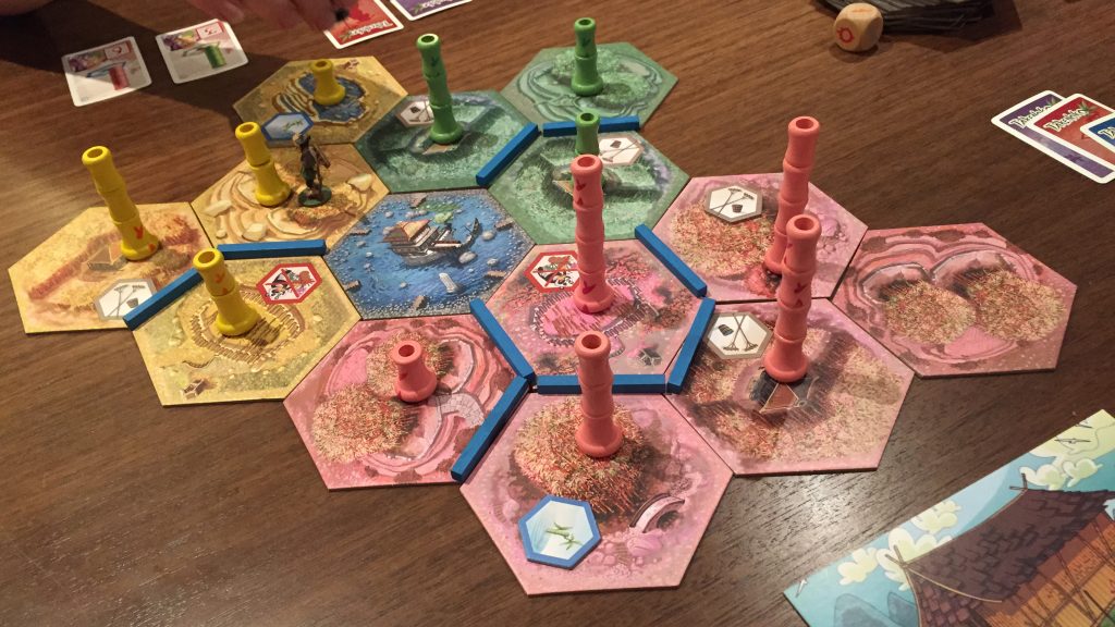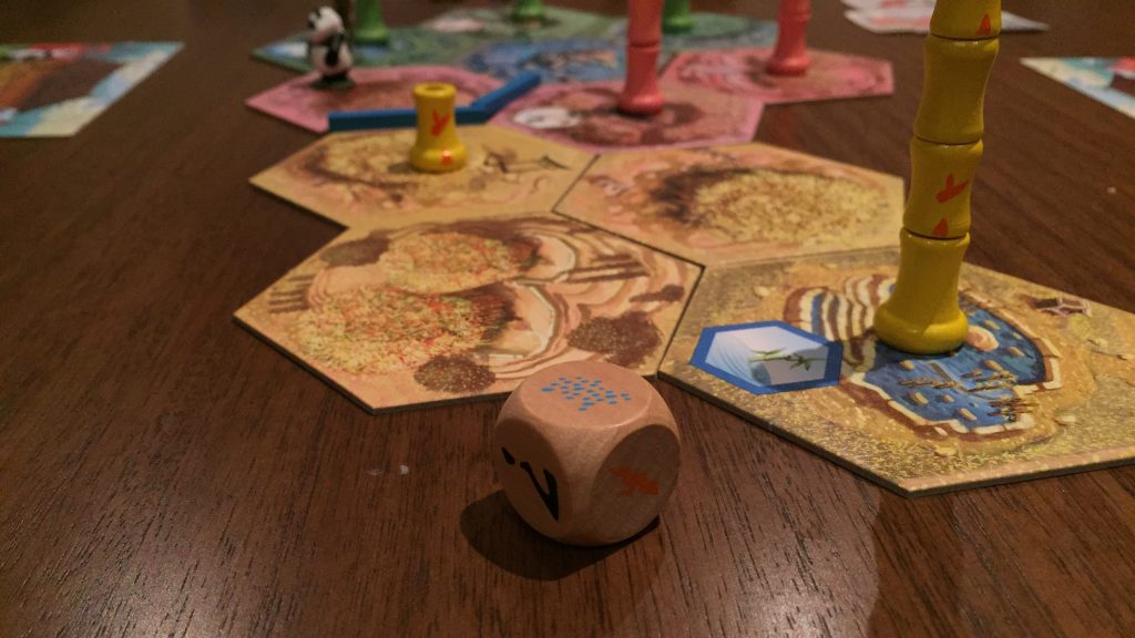 Takenoko doesn’t have a traditional “board” but uses hexagonal tiles to gradually grow a shared play area. The game starts with a single hexagonal piece (the pond) and, as players opt to expand the royal garden, additional haxagonal tiles are added. Hexagonal tiles come in three colors – each indicating the type of bamboo that can be grown. Some also have improvements like self irrigation, fertilization or even an enclosure to prevent the Giant Panda eating bamboo. When choosing to expand the royal garden players draw the top three tiles, place one on the playing field and return the others to the bottom of the stack. This approach gives the player more control over the outcome than just “drawing the top tile and placing it somewhere on the field”. This, like everything else in Takenoko is implemented perfectly. It blends random chance with decision making to leave the player feeling engaged whilst not taking away the sense of apprehension.