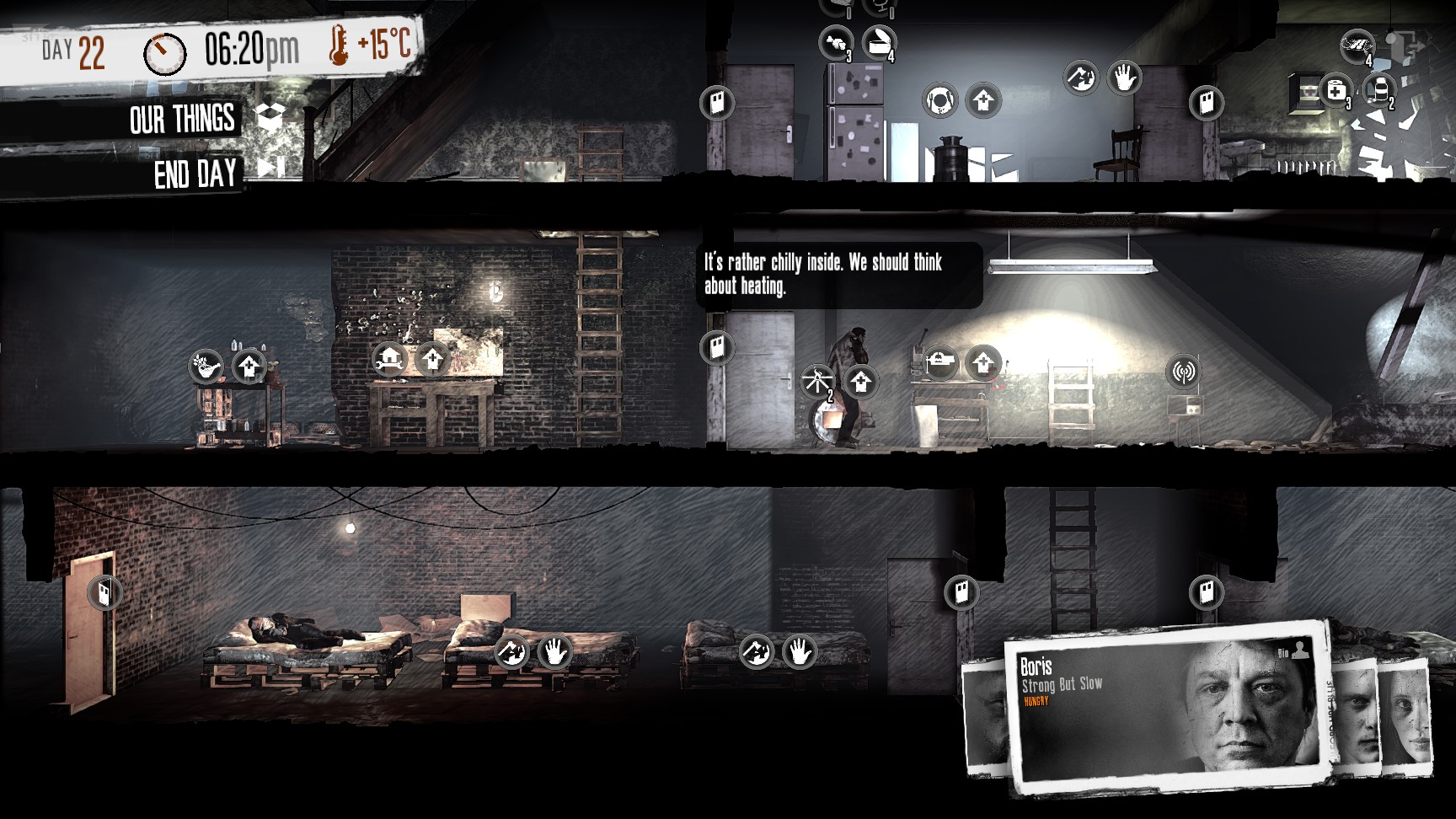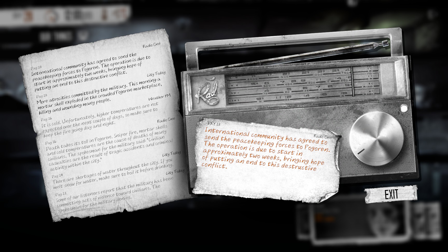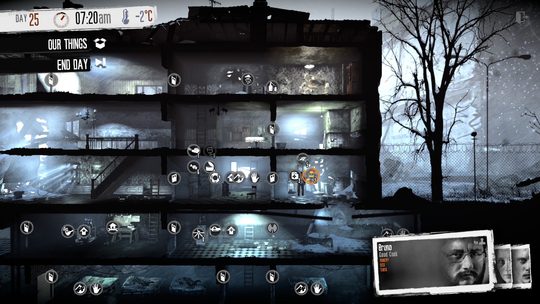 This War of Mine is a survival-themed strategy game where the player controls a group of civilian survivors hiding inside a damaged house in the besieged fictional city of Pogoren, Graznavia. The main goal of the game is to stay alive during the war using the tools and materials that the player can gather. Most of the characters under the player's control have no military background nor any kind of survival experience, and will require constant intervention by the player in order to stay alive. The player must maintain their characters' health, hunger, and mood levels until the declaration of a ceasefire, which occurs after a randomized duration.