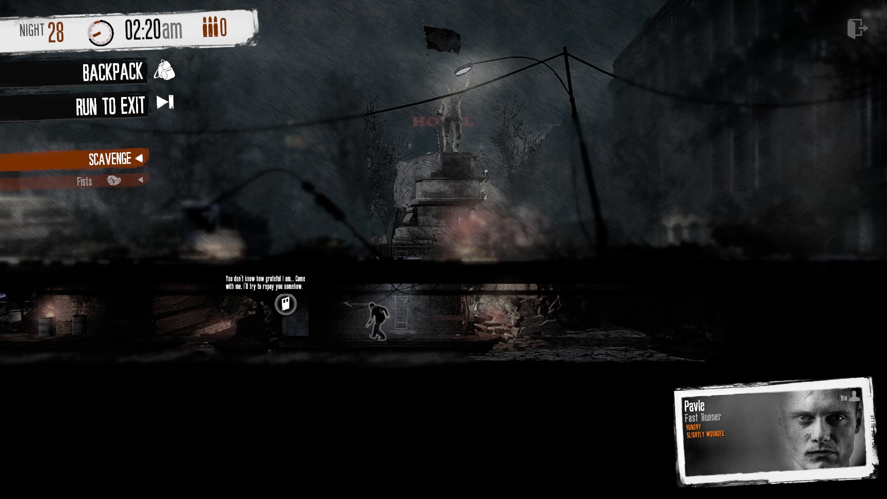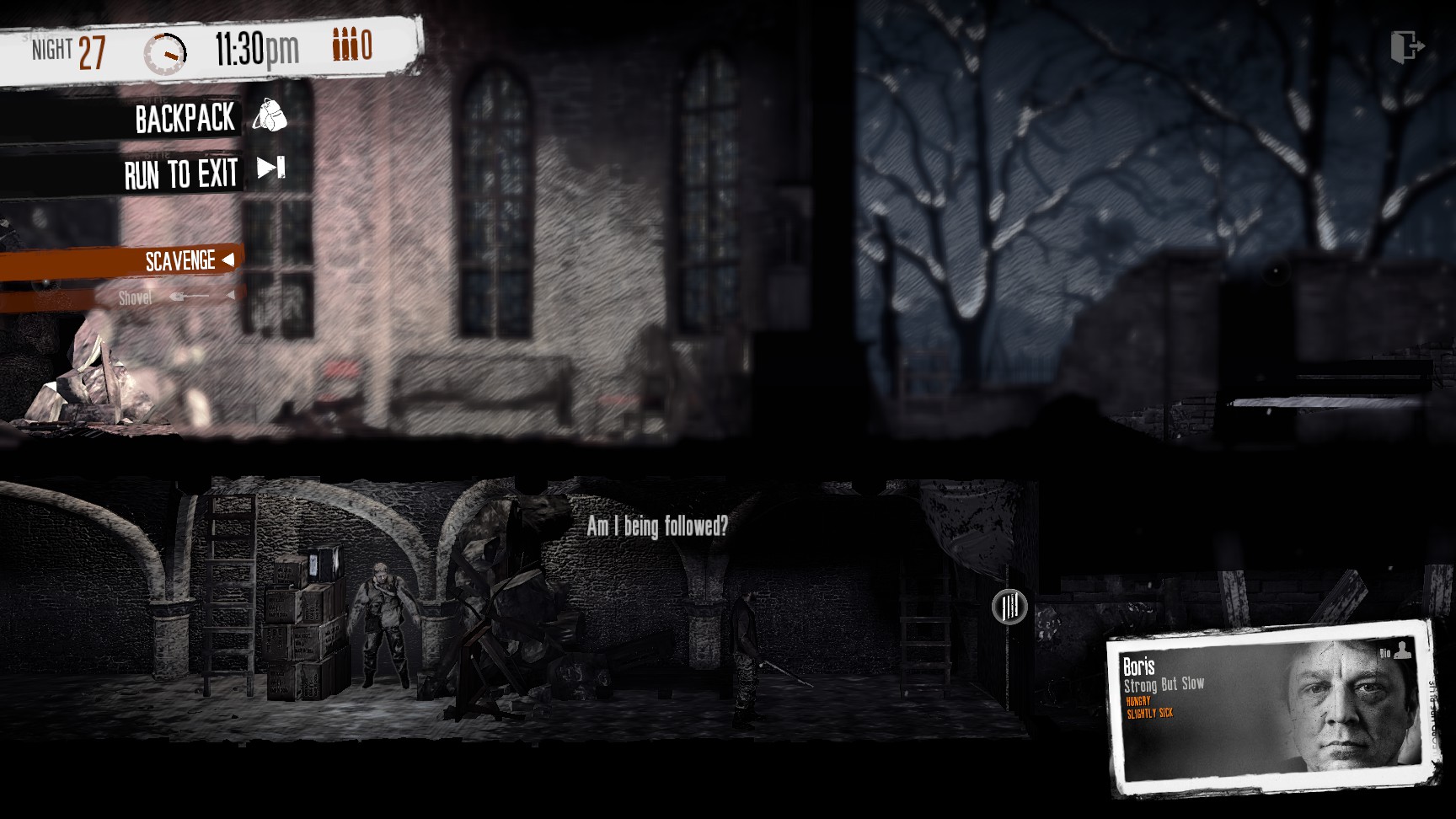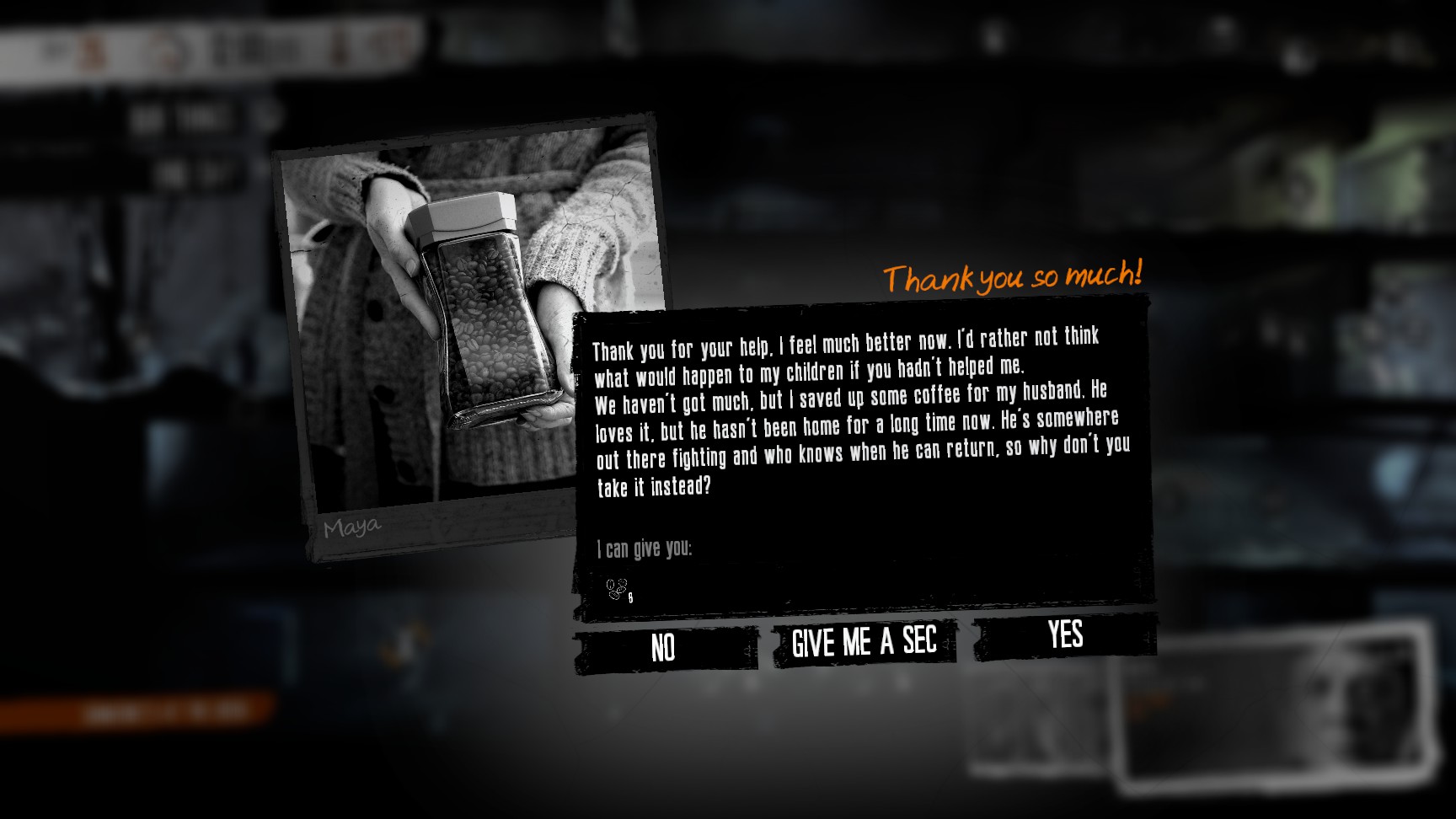 This War of Mine is a survival-themed strategy game where the player controls a group of civilian survivors hiding inside a damaged house in the besieged fictional city of Pogoren, Graznavia. The main goal of the game is to stay alive during the war using the tools and materials that the player can gather. Most of the characters under the player's control have no military background nor any kind of survival experience, and will require constant intervention by the player in order to stay alive. The player must maintain their characters' health, hunger, and mood levels until the declaration of a ceasefire, which occurs after a randomized duration.