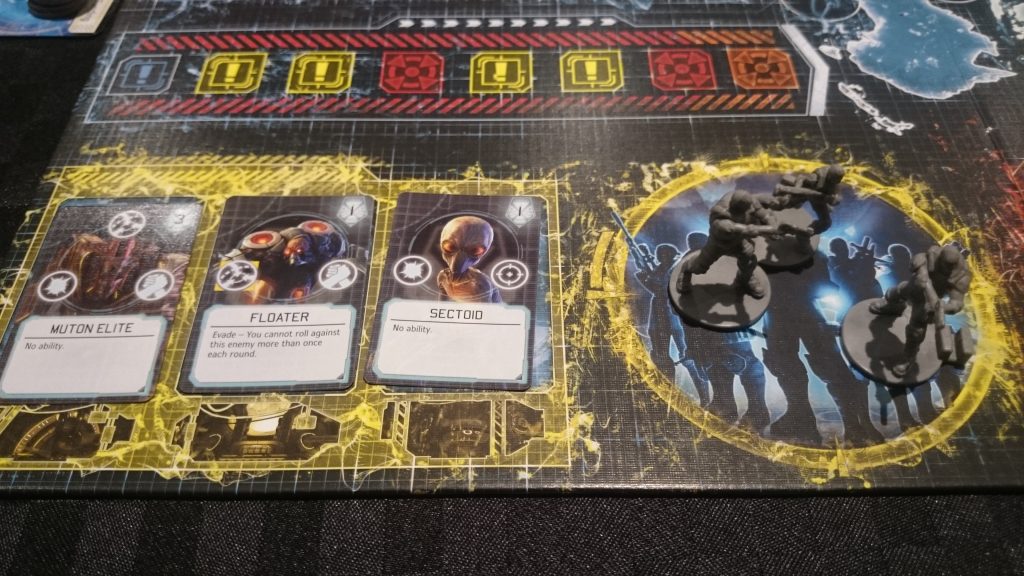 While the mechanic was good I felt the tasks weren’t balanced well enough to make the decision to gamble tough. When researching or performing orbital defence a loss resulted in exhausted asset (unusable until next round) whereas base or global defence failure resulted in the loss of asset meaning you had to wait an entire round until you were able to purchase a new one. Worse still, if you left a global or base defence unresolved, you suffered the same negative effect as if you’d failed. You don’t lose the asset but would suffer base damage or a rise in panic. So, in most cases, why wouldn’t you gamble? Another issue with the mechanic was that, for each battle, the threat track returned to 1. So, if you had two soldiers with which to attack a muton why would you put them together and roll two dice when you could attack separately and reset the threat track between battles?