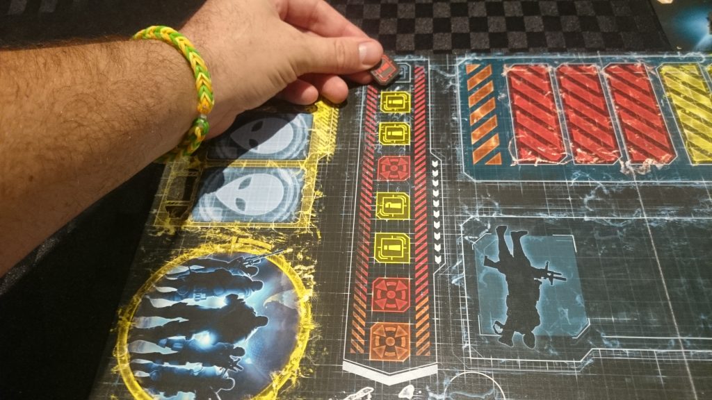 After the timed phase is complete you enter the resolution phase. Whilst still controlled by the app this phase has no time limit allowing you as much as you need to resolve the effects of decisions made during the timed phase. Most tasks are resolved using a clever “push your luck” dice mechanic in which you simultaneously roll one XCOM die per unit assigned alongside a red alien die. An Xcom die is a d6 with a 1 in 3 chance of success and the alien die is a regular d8. The alien die relates to a threat track located on the board. When resolving a task, if the alien die is equal to or less than the number on the threat track the resolution is deemed a failure and the assets lost/exhausted. If you don’t roll enough successes to complete a task you have the option to “push” allowing you to re-roll all die for additional successes. The risk involved in this is that, each time you push, you must increase the threat track by one thus increasing your chance of asset loss. I really enjoyed this aspect of the game and felt it added something new to a basic fail/success die roll.